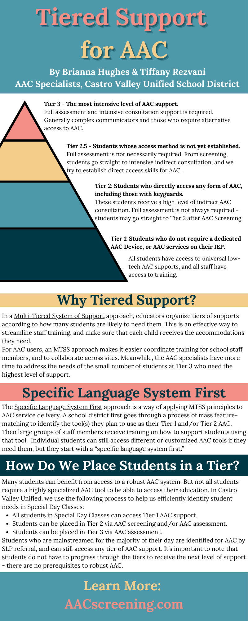 Our AAC Screening is a method of quickly identifying the types of communication support that would benefit a particular child. More specifically, we use it to help us find children within a public school district, ages 3-5, who would benefit from a high-tech speech-generating device. We use this tool in the context of a multi-tiered system of support for AAC, ensuring that all decisions about accommodations are made by the IEP team and documented carefully. AAC Screening has benefits for kids, families, and professionals!